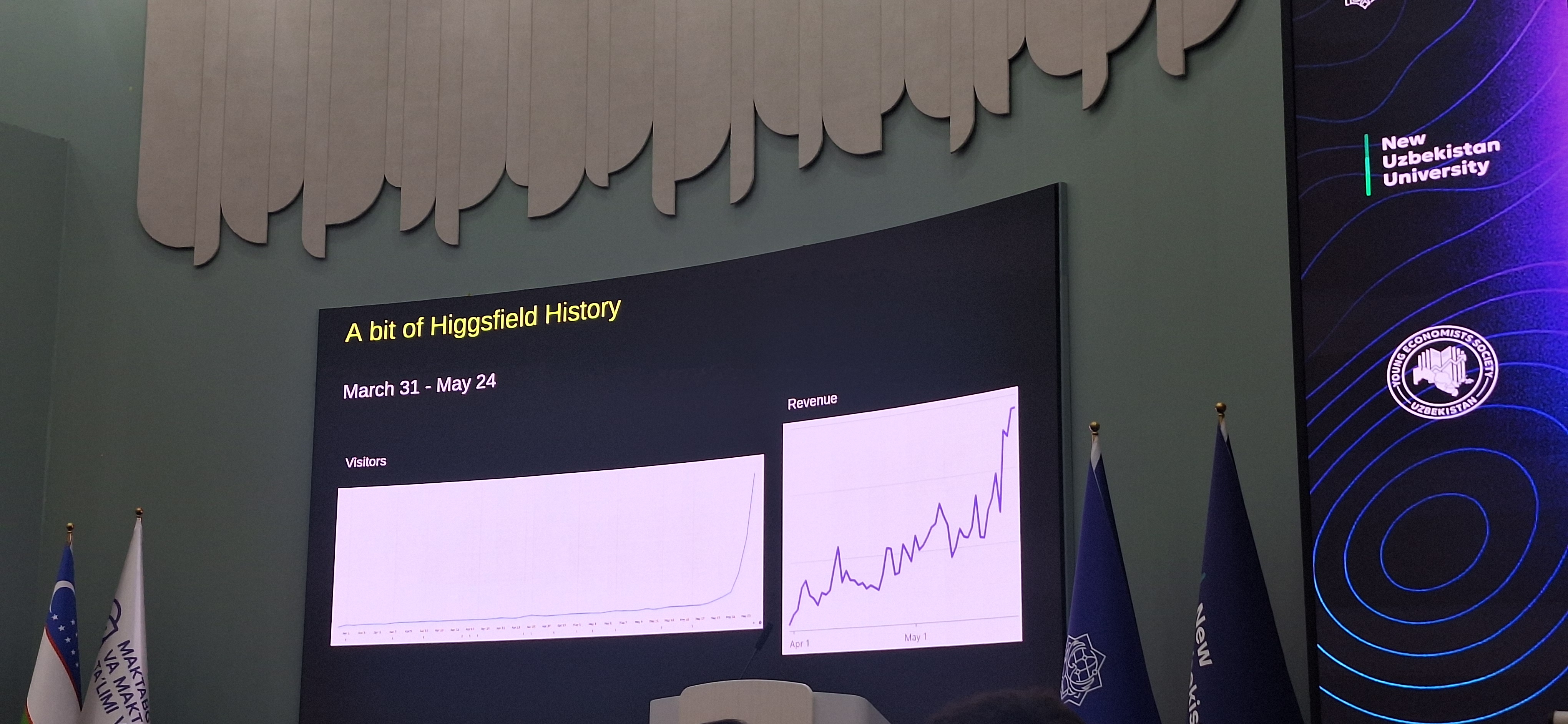 Higgsfield AI, по словам CEO, является самым быстрорастущим стартапом в сфере генеративного ИИ (GenAI) в мире. За шесть месяцев компания достигла оценки, превышающей $1 миллиард. Графики, представленные на слайдах, демонстрируют экспоненциальный рост посетителей и выручки в период с 31 марта по 24 мая.